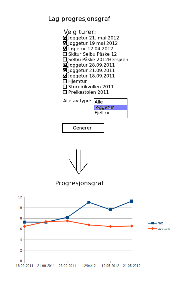 Grafen ble fin den, den viste faktisk fremgang. Men, det fordrer jo at jeg vedlikeholder et regneark med verdier jeg kopierer (manuelt) ut fra Mineturer, setter opp grafen etc. Så tenkte jeg litt til. Jeg har jo dataene og et godt verktøy for å lage grafer i Mineturer. Basert på dette lagde jeg en skisse på hvordan jeg ser for men en slik “progresjonsgraf” (som jeg har valgt å kalle den). Skissen burde være selvforklarende, du velger ut de turene du har lastet opp i mineturer (eventuelt en kategori, slik som “Jogging”) og trykker “generer”. Da får du en graf, med datoene ordnet stigende på x-aksen og to linjer for hhv avstand og snittfart på y-aksen. Slik kan du etter hver opplastet tur sjekke frem/tilbakegangen. Skissen ser altså slik ut: