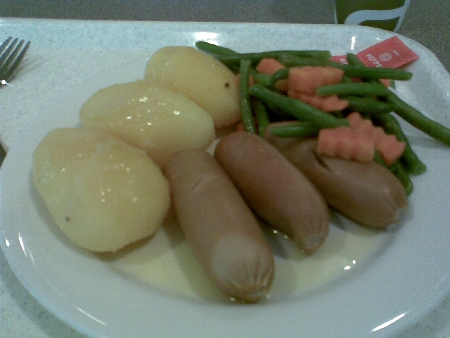 Og prisen for denne herligheten? 48 kroner. Dette er helt hårreisende spør du meg. Tre slitne pølser, potet litt overkokte grønnsaker og smelta smør? Hvor mye kan dette koste? Og tar man i betraktning at SiT skal gå i null og ikke betaler leie for lokaler står vi igjen med at disse 48 kronene skal dekke lønn og råvarer.