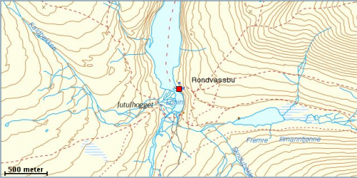 For å illustrere forskjellen mellom OpenStreetMap sine kartdata i “bushen” med Kartverket sine søkte jeg opp DNTs hytte Rondvassbu i henholdsvis OpenStreetMap og Kartverkets Norgesglasset, som har N50 dataene.
