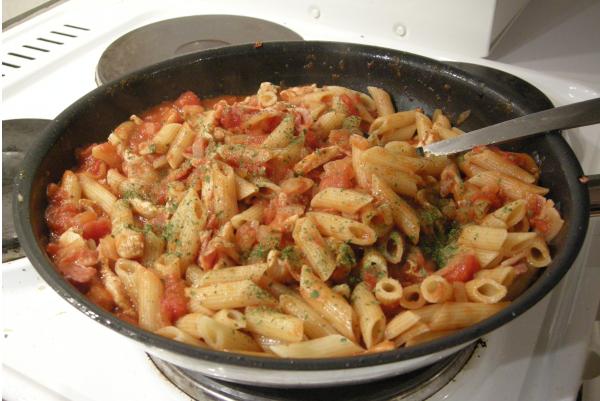 Jeg har tatt utgangspunkt i oppskriften fra Sølvsjeen, men tilsatt kjøtt og løk for å få en mer mettende rett. Tar ikke lang tid å lage, smaker digg og koster ikke all verden (du kan sikkert droppe det ene og det andre her til du ender opp med standard arrabiata, dess mer du tar ut dess biligere blir det!)