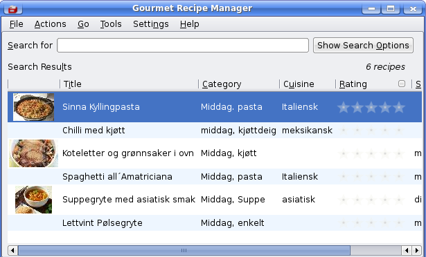 Vel og bra, man kan jo gjøre slikt på papir, det tar jo ikke så lange tida, og det er vel det norske husmødre (all ære til denne utdøende rase) har gjort i alle år. For en geek er ikke saken så enkel. Jeg begynnte å tenke på en database med alle oppskrifter som kunne generere handleliste. Imidlertid tok jeg et nettsøk, og da fant jeg det jeg tenkte på: “Gourmet Recipe Manager” for Linux. Som de sier selv: