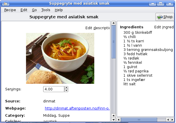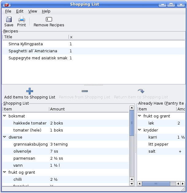 Her ser man altså oppskriftem og kan eksportere den til html, pdf, Gourmet XML, MealMaster eller plain tekst. I tillegg kan man vha knappen “Shop” legge den til handlelisten. Dette er det mest geniale aspektet. Her summerer den opp alle ingredienser for valgte retter og lager en handleliste, basert på kategorier. Du kan også markere hva du har fra før. Et eksempel på handleliste for tre retter kan se slik ut: