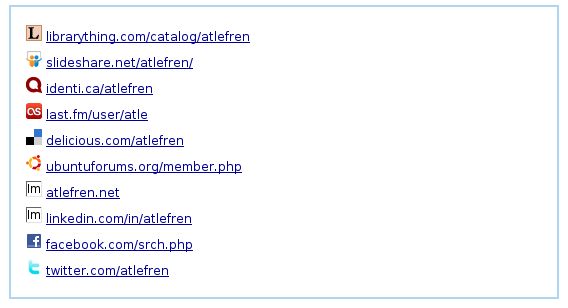 I disse “sosial web”-tider er man registrert både her og der, på forskjellige steder med forskjellige brukernavn. Jeg har listet de fleste sidene jeg er registrert på på Om Atle-siden. For noen dager siden tipset Øyvind Solstad om en tjeneste som gjør noe av det samme, nemlig socialwhois.com.
